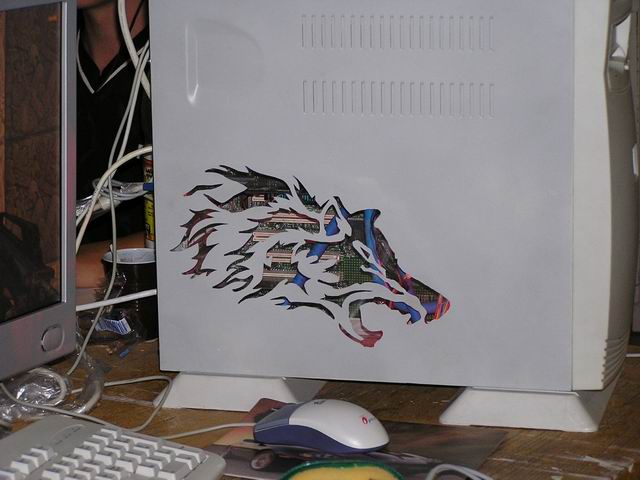 Tak toto bola moja úplne prvá modifikácia. Skúsenosti s rezaním do plechu som nemal žiadne. Motív ktorý som použil je odvodený od obrázku ktorý sa so mnou už niekoľko rokov vláčil (ako pozadie, logo, atď). Začalo to prerobením obrázku do B/W [black and white] farieb (ešte som neovládal prácu s grafickým softwarom). Obrázok som vytlačil, vystrihol nožnicami a obkreslil na plech. A potom prišla na rad vŕtačka a lupienková pilka. Tí ktorí už s lupienkovou pílkou pracovali vedia, že je treba trpezlivost a istú ruku. Pod motív vlka som uchytil plexo bielim silikónom (nemal som transparentný) po obvode plexa. Na prvý krát to do dopadlo dobre - teda hlavne ja som bol spokojný.